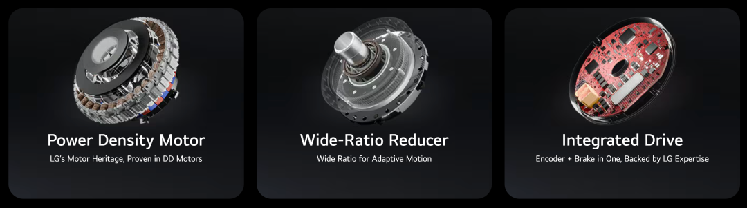 该系列执行器的精准运动性能,依靠三大核心部件实现,每个部件都有专属技术优势:功率密度电机承袭了LG成熟的DD电机技术;宽速比减速器采用宽速比设计,能适配机器人的自适应运动需求;集成驱动器整合了编码器与制动器功能,技术实力源于LG多年的专业积累,这些部件的协同配合,是机器人实现精密运动的基础。