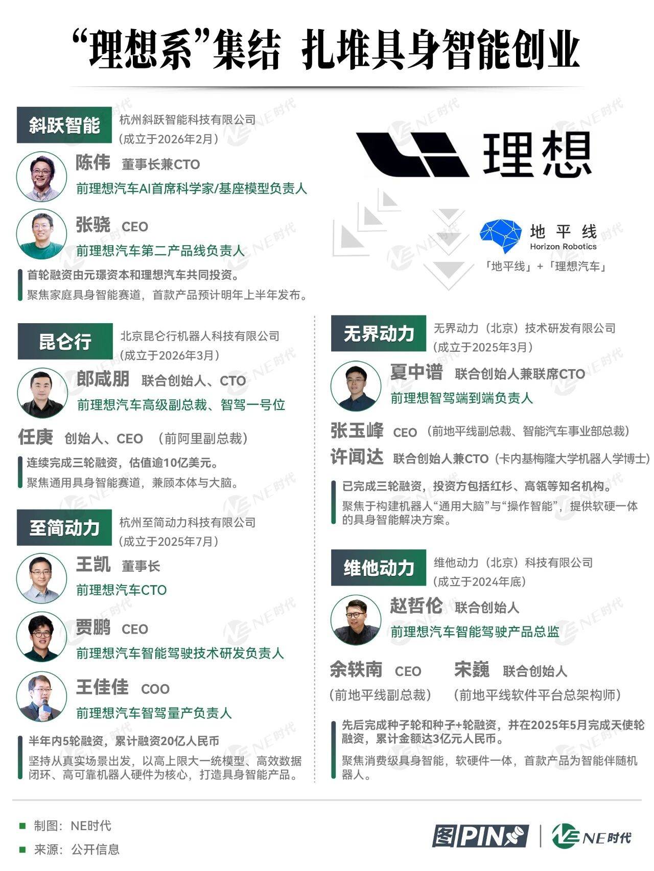 当下,多位前「理想系」高管纷纷投身具身智能赛道创业,相关动作密集落地。近日,理想汽车前AI首席科学家、基座模型负责人陈伟,与理想汽车前第二产品线负责人张骁联手创办具身智能企业「斜跃智能」。陈伟出任公司董事长兼CTO,张骁担任CEO。该公司成立于2026年2月。值得一提的是,首轮融资由元璟资本与理想汽车共同领投,近期将完成工商变更。斜跃智能聚焦家庭场景,主打面向C端用户的消费级具身智能产品,首款产品预计于明年上半年正式发布。除「斜跃智能」外,原理想汽车高级副总裁、“智驾一号位”郎咸朋和阿里前副总裁任庚携手创业「昆仑行」,其中郎咸朋担任联合创始人、CTO;任庚担任创始人、CEO。「昆仑行」于2026年3月完成注册,成立后接连完成三轮融资,当前估值已突破10亿美元,业务聚焦聚焦通用具身智能赛道,兼顾本体与大脑。除陈伟、张骁、郎咸朋等核心人物外,至简动力、无界动力、维他动力等多家企业中,也均有「理想系」的身影。同时也不乏“地平线+理想汽车”复合背景的通用具身智能团队。