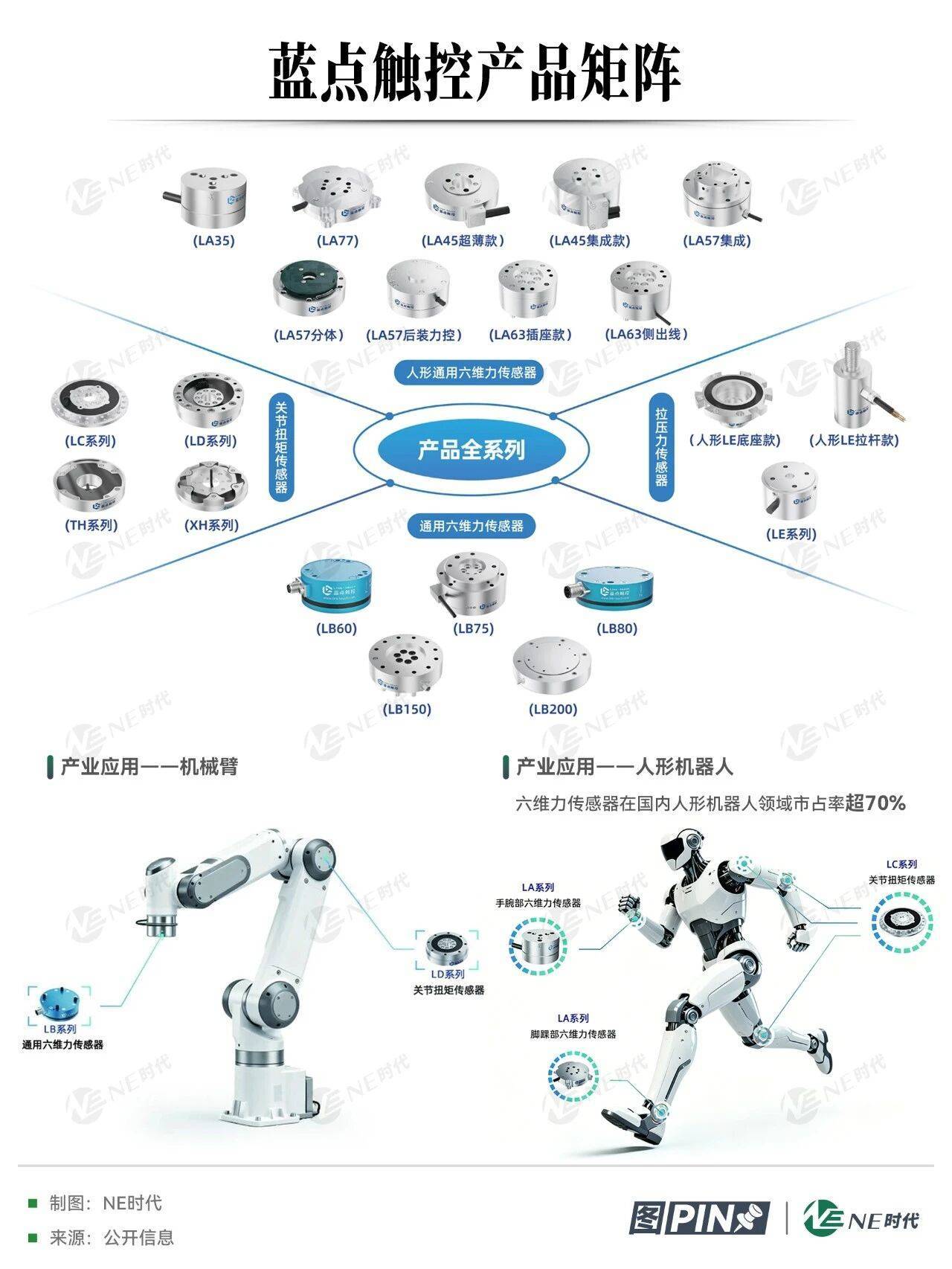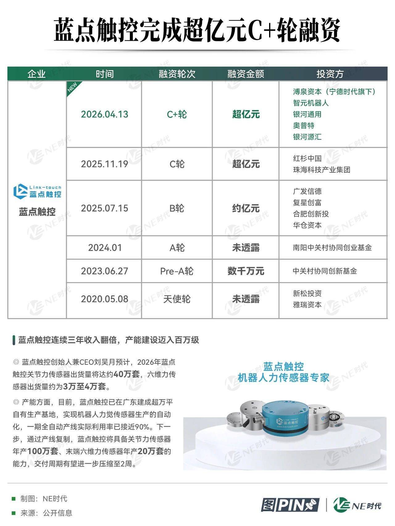 蓝点触控(北京)科技有限公司(以下简称“蓝点触控”)近日宣布完成超亿元C+轮融资。由宁德时代旗下溥泉资本、智元机器人、银河通用、奥普特、银河源汇等机构联合投资(图2)。值得注意的是,智元机器人和银河通用此前已是蓝点触控的客户,而宁德时代的布局也正逐步向产业链上下游延伸。本轮融资将主要用于新产品研发、生产数智化建设以及国内外市场拓展,这也是蓝点触控近一年内完成的第三轮过亿元融资。蓝点触控成立于2019年,核心聚焦机器人力传感器领域,目前已搭建起涵盖高性能弹性体设计、嵌入式硬件电路、高精度结构解耦算法及六维同步校准在内的四大平台型技术,形成了人形机器人专用力传感器、通用力传感器、力控综合解决方案及复合型机器人工作站等多元化产品体系(图1)。蓝点触控的产品具备0.1%FS的高精度、10kHz以上高频响应、500%抗过载等优异性能指标,目前已获得智元、小米、小鹏、银河通用、众擎、优必选、星海图、北京人形机器人创新中心等头部人形机器人企业的批量订单。凭借核心技术优势,蓝点触控的六维力传感器在国内人形机器人领域市占率更是超70%。经营层面,蓝点触控已连续三年实现销售收入翻倍,并达成盈利。公司创始人兼CEO刘吴月预计,2026年蓝点触控关节力传感器出货量将达约40万套,六维力传感器出货量约为3万至4万套。产能保障方面,蓝点触控目前已在广东建成超万平自有生产基地,实现机器人力觉传感器生产的自动化,一期全自动产线实际利用率已接近90%。下一步,通过产线复制,蓝点触控将具备关节力传感器年产100万套、末端六维力传感器年产20万套的能力,产品交付周期有望进一步压缩至2周。