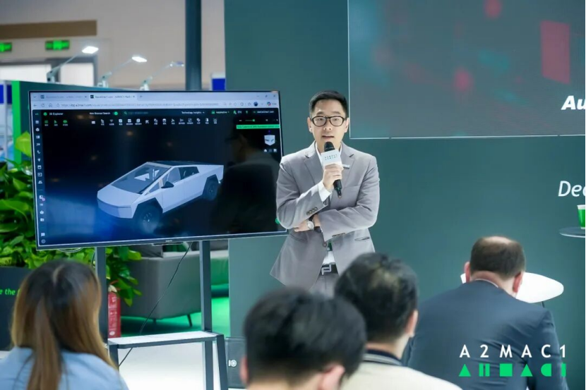 在现场演示中,A2MAC1展示了其3D Web平台,可查看整车及零部件的3D扫描数据。以特斯拉Cybertruck为例,平台可呈现整车扫描、总布置、结构框架及零部件爆炸图,并进一步链接材料、重量、尺寸、照片、供应商和成本等信息。
